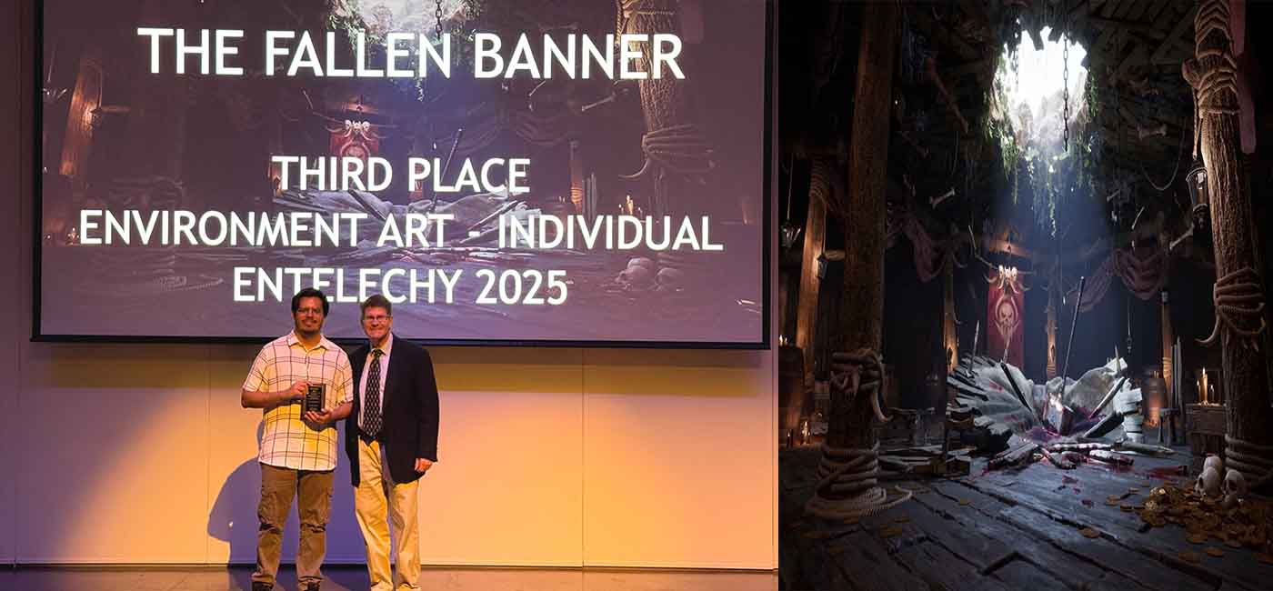 Bhavya has made his mark on the global stage by winning 3rd place at SCAD Entelechy 2025 in the Individual Environment Art category! His award-winning piece, The Fallen Banner, is a stunning 3D environment inspired by the world of Dungeons & Dragons — depicting a shattered goblin council chamber destroyed by a paladin.